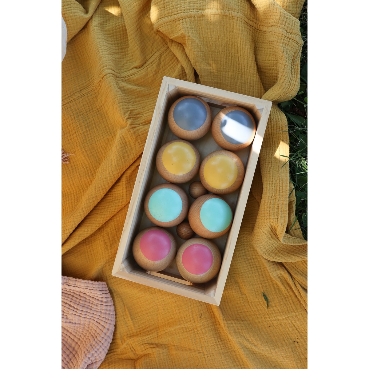 Dieses klassische Boule-Spiel wird aus nachhaltig gewonnenem Holz hergestellt und in einer praktischen Aufbewahrungsbox geliefert. Es ist ein ideales Spiel für die ganze Familie. Es fördert die Hand-Augen-Koordination und regt die Farberkennung bei kleinen Kindern an.