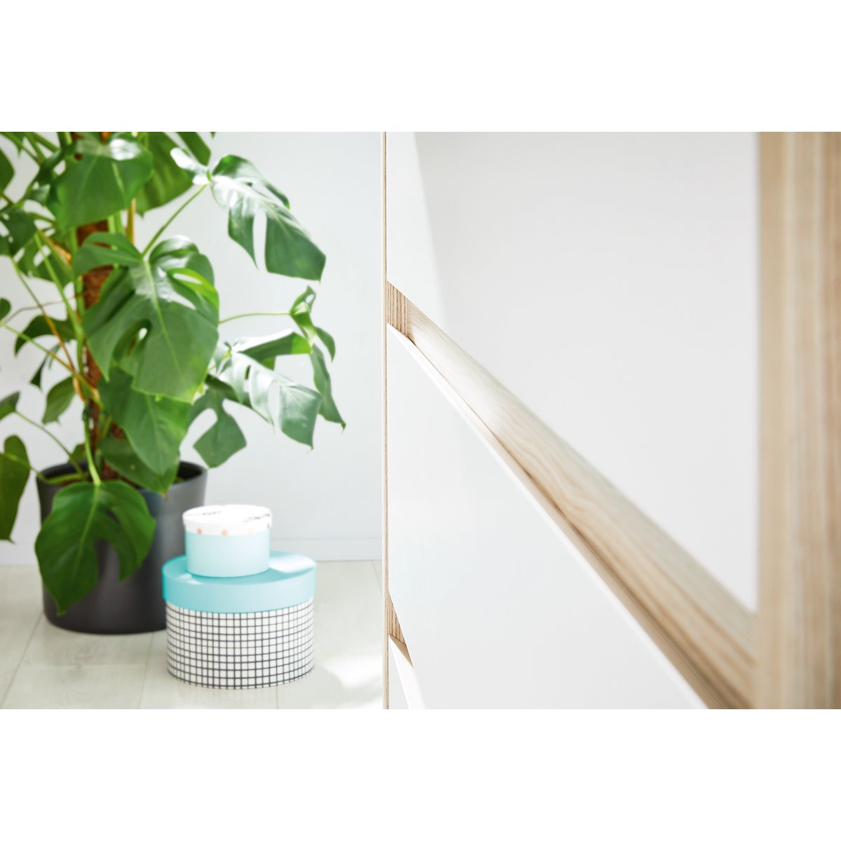 Das geräumige und großzügige Kinderzimmer „Flow“ besticht durch seine Optik: Esche mit Echtholzrahmen und schlichtem Weiß. Bett: L 145 x B 75 x H 85 cm, Matratze: 140 x 70 cm, Wickelkommode: B 105 x T 77 oder 55 x H 98 cm, Kleiderschrank: B 155 x T 55 x H 185 cm. „Flow“ ist die perfekte erste Babyausstattung: Das 3-stufige Babybett lässt sich mit den Umbausätzen in ein Juniorbett und ein Kindersofa verwandeln. Der Lattenrost ist in drei Stufen von 22 bis 37 bzw. 52 cm höhenverstellbar. Dank des Selbstschließmechanismus mit Soft-Close-Funktion schließen Türen und Schubladen sanft und leise. So wird auch verhindert, dass sich kleine Kinderfinger einklemmen. Hochwertige Möbel aus massiver Kiefer runden das Design ab. Die Wickelkommode ist abnehmbar und kann nach dem Wickeln als elegante Kommode genutzt werden – ein Möbelstück, das besonders lange hält. Die 3 Schubladen bieten viel Stauraum – Spacepinolino verkauft seit 1997 Kindermöbel, Accessoires und Spielzeug.